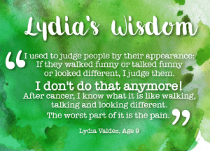 Lydia was wise beyond her years and never once did she feel sorry for herself. As a matter of fact, she spent a lot of her time encouraging others not to feel sad. She learned a valuable lesson in her short life as she spoke of in this quote. We call it “Lydia’s Wisdom”: